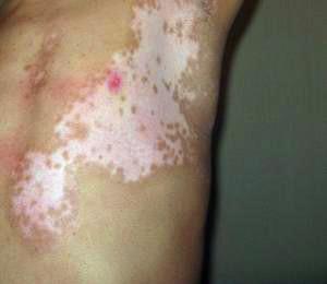 1)完全性白斑:白斑为纯白色或瓷白色,白斑中没有色素再生现象,白斑组织内黑素细胞消失,对二羟苯丙氨酸反应阴性 。