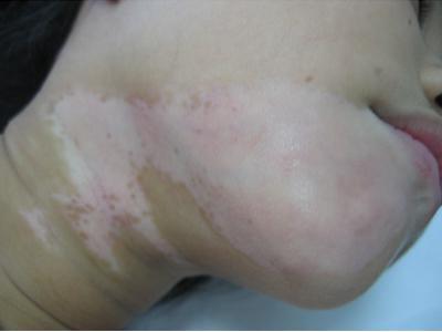 节段型白癜风的皮损面积通常较小,病情发展趋势明显,容易控制。白斑为一片或者数片,沿着某一皮神经节段支配的皮肤区域走向分布,多为单侧分布;第二,节段型白癜风大多会发生白发,部位通常为头发和眉毛。调查发现,儿童为阶段型白癜风的易发人群,占发病总数的20%左右。据病损处色素脱失情况又可将该病分为完全型与不完全型两种。前者对二羟苯丙氨酸(DOPA)反应阴性,黑素细胞消失,治疗反应差。后者对DOPA反应阳性,黑素细胞数目减少,机率大。