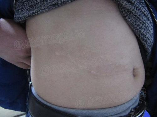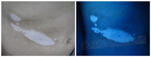 1、wood灯:腹部、肛周等处均有不同程度的色素脱失(详见图片)