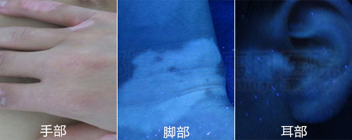 4、Wood灯检查:面部,耳前,手部,脚部,腿部,肛门,背部呈不同程度色素脱失