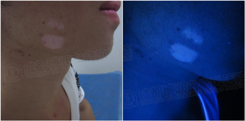 ▲伍德灯:右面部 有斑片状色素脱失性白斑,边界不清晰