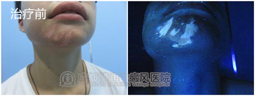 ▲伍德灯:下颌处白斑不同程度色素脱失