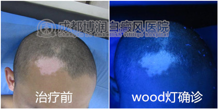 ▲wood灯:额部 有斑片状色素脱失性白斑,边界不清晰