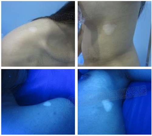 ▲伍德灯:肩部白斑,胸部白斑,腰部白斑,手部白斑色素脱失约30--90%。