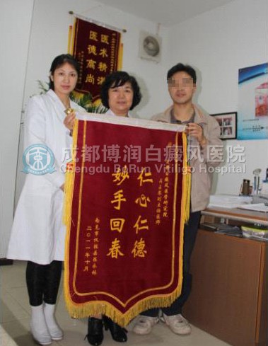 于是千里迢迢来到成都博润白癜风医院挂了吴占琴医生的号。医院墙壁上挂满了患者送来的锦旗、合影、题词,还有很多康复患者的感谢信、想不到这里这么资深,而且看到很多来复诊的患者,他们有的病情以前比我还严重,现在都恢复的挺好的,这让我感到很震撼,令我信心倍增,要是能早一点知道来这里治疗就好了。吴医生根据我的病情为我制定了一整套个性化治疗方案,治疗两个疗程之后,身上的块块白斑竟然奇迹般的消失了!现在我正在做进一步的巩固治疗,看着白斑渐渐消退,我终于找回了昔日的健康和自信!