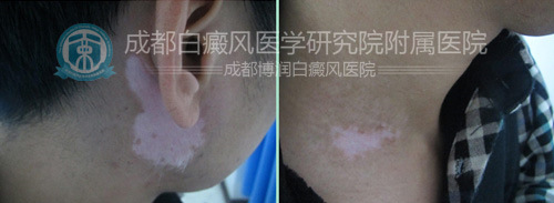 重庆市沙坪坝区的陈某某,18岁时患上白癜风,右侧耳后、颈部、胸部均有白斑。来我院治疗前,陈先生曾在重庆某家公立医院治疗过,自己购外用药治疗,都没有治好身上的白癜风。后来到成都白癜风医学研究院附属医院就诊治疗,3个月后,白斑消失。