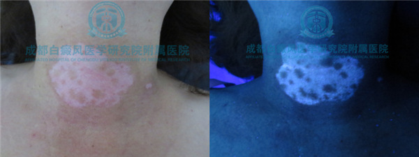 (患者来我院初诊时,颈部白斑在wood灯下显示黑色素大量缺失)