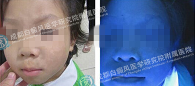(初诊时,佳佳面部的白癜风在wood灯下显示色素脱失严重,边缘模糊,处于进展期)