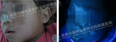 1、伍德灯检查:面部白斑色素不完全脱失,边缘模糊;