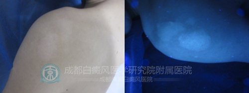 4、wood灯:肩部均有不同程度色素脱失性白斑