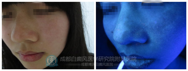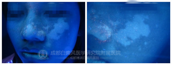4、wood灯:面部均有不同程度色素脱失性白斑