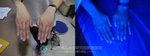 ▲病史:患者双手部因冻疮引起白斑1年,曾在当地防疫站治疗过,使用外用药(药名不详)、口服药,效果不佳,今日来我院就诊。