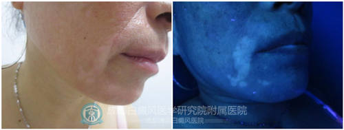 ▲病史:患者自诉1周前发现面部出现不同程度色素脱失,曾在省医院诊治,使用外擦药,效果不佳,自觉白斑扩散,今日来我院就诊