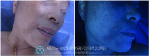 4、wood灯:面部均有不同程度色素脱失性白斑