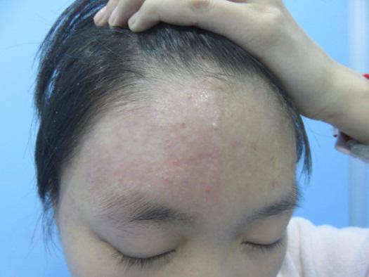 现病史:本人自诉右侧额部白斑7年,曾在成都其他综合医院、皮肤医院治疗无效果,遂来我院治疗。