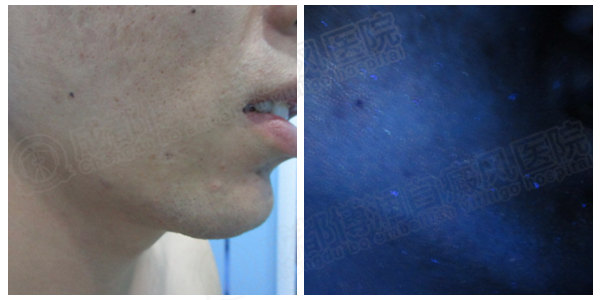 Wood灯检查下面部白斑色素脱失明显