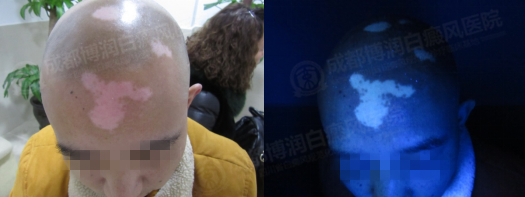 现病史:患者于2个月前发现额头白斑,在德阳当地医院治疗过1个月,用药不详。今日来我院继续治疗。