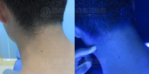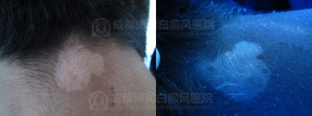 wood灯:后颈部 有斑片状色素脱失性白斑,边界不清晰