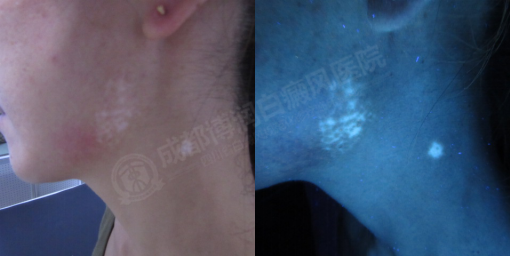 wood灯:颈部 有不同程度斑片状色素脱失性白斑,边界不清晰。