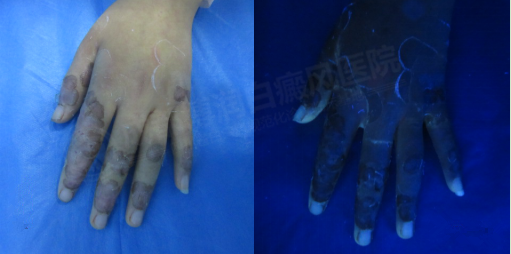 4、wood灯:手有斑片状色素脱失性白斑,边界不清晰。