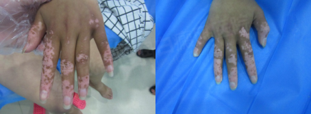 童学娅主任对白癜风研究有数年的历史经验,在接待了阳阳之后,结合阳阳的身体状况,立刻给出了精准的治疗方案!由于阳阳的白癜风还处在进展期,所以童主任先采用智能308和中药塌渍等使得其进入稳定期,当白癜风不再扩散的时候,由其他正常的皮肤打磨出正常的黑色素细胞,通过表皮移植术来植入病灶皮肤区域,白癜风部位加入新活的黑色素细胞,慢慢的恢复正常。