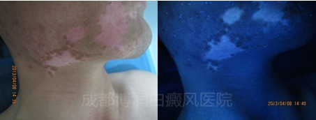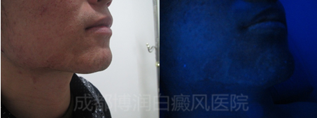 初诊时,患者下颌明显黑色素脱失,存在部分隐性白斑