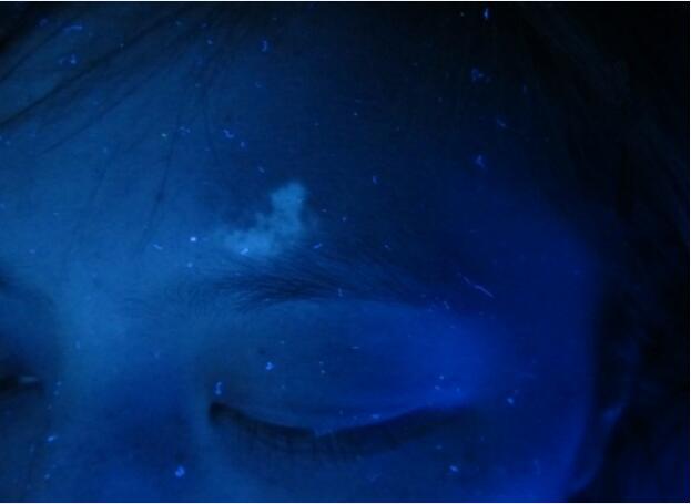 (Wood灯下检测图,黑色素消失、白斑清晰可见)