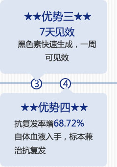 "蓝氧祛白疗法﹠308nm准分子光"治疗白癜风,以其治疗全程安全无痛、疗程缩短、七天可见疗效、有效抗复发等特点,得到5大权威机构以及国际医学界100多位权威专家一致认可,成为了国际多个权威医学机构共同推荐的白癜风患者治疗首选方案。"蓝氧祛白疗法﹠308nm准分子光"针对白癜风的治疗,可直接快速激活自身免疫系统使人体产生长久免疫。从根源上彻底解决各类型白癜风患者色素再生问题,获得了白癜风医学史上的重大突破,成为全球重点推广技术,让数亿白癜风患者重获新生。