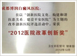 2013年1月,由卫生部医管司和健康报社主办的"2012医院改革创新奖颁奖典礼"结束,我院作为西南地区专业治疗白癜风的标杆研究院, 荣获"2012医院改革创新奖"。