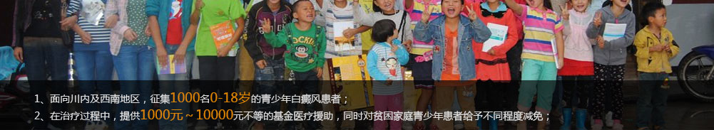 徐冰(化名),今年19岁,来自四川省自贡市贡井区的一个小村庄。父母是朴实的农民,靠种地维持全家人的生活,家里还有一个9岁的弟弟在读书。徐冰几年前患了乙肝大三阳,花费了大笔医疗费用;2012年4月,徐冰发现自己的左侧脸颊有一块白色斑点,当时没有在意,一个月后,白色斑点大了一倍,而且有向脖颈延伸的趋势...【详细】
