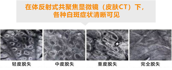 作为白癜风检测领域全新科研技术,在体反射式共聚焦显微镜(皮肤CT),采用激光点光源代替传统光镜的场光源,基于光学聚焦原理,利用计算机三维断层成像技术,对皮损部位进行扫描成像,可实现直观、实时、动态、地观测白癜风的发生、发展、皮损情况及其治疗疗效的影像分析系统,采集细胞尺度的活组织的图像和录像。这种非侵入性的“光学切片”,为白癜风临床的科学诊疗提供了科学依据和保障。