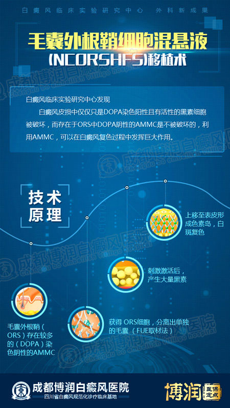“作为研究的专项科研成果,毛囊外根鞘细胞混悬液(NCORSHFS)移植技术,经过近2年的临床试验、研究、对比,目前,已成功运用于白癜风临床诊疗。”—白癜风临床实验研究科研主任兰长贵教授