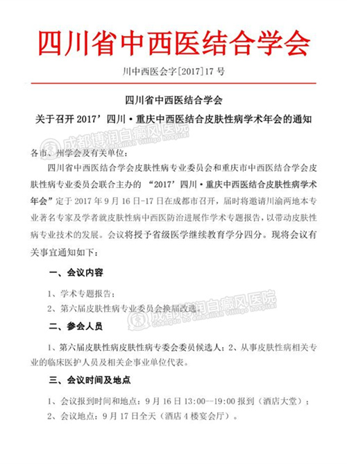 为紧跟国际中西医结合治疗皮肤病较新进展,增进皮肤病学科学术交流。2017年9.16—9.17日,由四川省中西医结合学会皮肤性病专业委员会、重庆市中西医结合学会皮肤性病专业委员会联合主办的“四川·重庆中西医结合皮肤病性病年会”即将于成都召开。邀请川渝著名皮肤科中医、西医、中西医结合医生共聚一堂,阐述皮肤科相关的较新研究进展,带动中西医结合治疗皮肤病专业技术的发展。