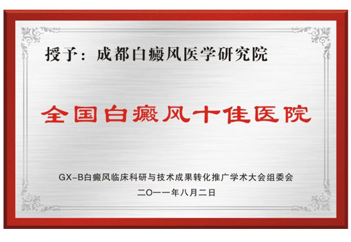 2011年8月2日,由中国中医药学会、中国中医药研究开发协会主办的“GX-B白癜风临床科研与技术成果转化推广学术大会暨全国白癜风康复爱心通道启动仪式”于在北京钓鱼台国宾馆隆重召开。大会综合白癜风科技转化成效、白癜风临床防治情况等标准,评选全国白癜风十佳医院,成都博润白癜风医院从30多家医院中脱颖而出,荣膺“全国白癜风十佳医院”称号。