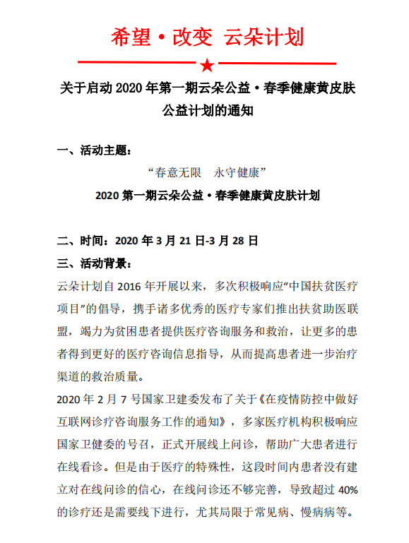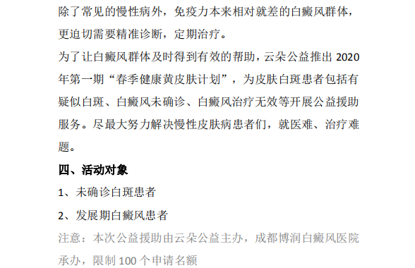 为了让白癜风群体及时得到有效的帮助,云朵公益联合成都博润白癜风医院推出2020年期“春季健康黄皮肤计划”,为皮肤白斑患者包括有疑似白斑、白癜风未确诊、白癜风治疗无效等开展公益援助服务。尽较大努力解决慢性皮肤病患者们,就医难、治疗难题。