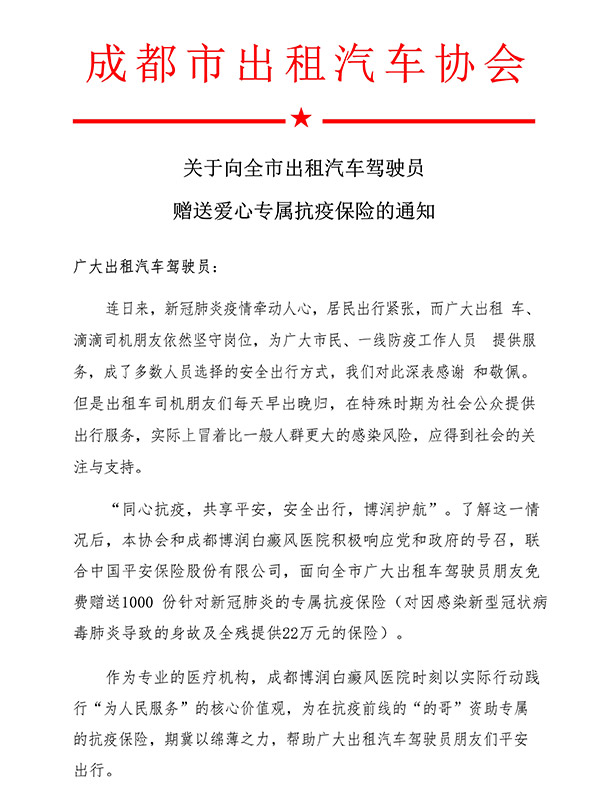 了解这一情况后,成都博润白癜风医院响应党和政府的号召,积极承担社会责任,在四川省红十字会的支持下,联合成都市出租汽车协会、中国平安保险股份有限公司,3月23日,由成都博润医院出资购买1000份《全市出租汽车驾驶员爱心专属抗疫保险》。