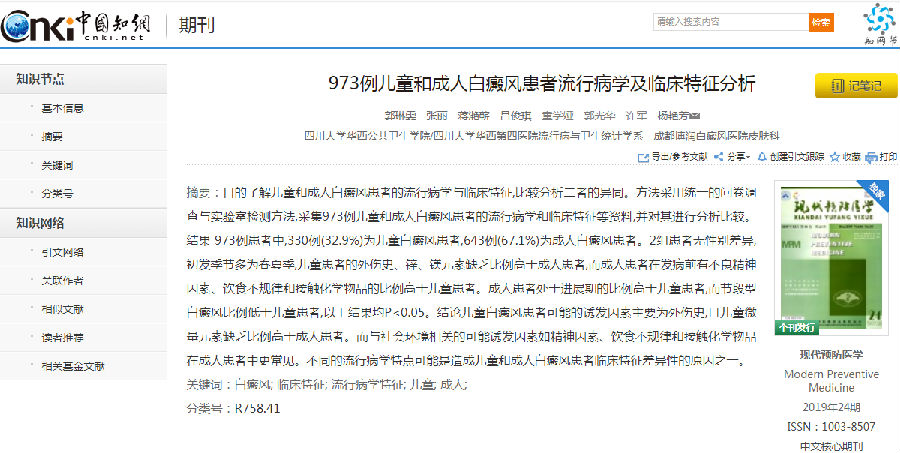 成都白癜风皮肤病医院童学娅等主任共同撰写的《973例儿童及成人白癜风患者流行病学及临床特征分析》医学论文荣登2019年第12期《现代预防医学》杂志。