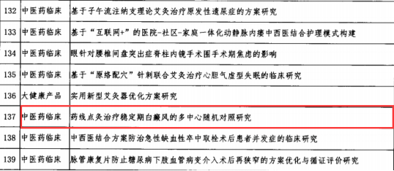 2020年12月15日,四川省中医管理 局公示了“2020年度中医药专项课题立项”名单,全省共403项课题予以立项,成都博润白癜风医院联合成都中医药大学附属医院申报的课题《药线点灸治疗稳定期白癜风的多随机对照研究》,经过审核,成功立项。