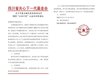 成都博润白癜风医院作为“云朵公益计划援助基金”承办机构,2022年5月1日-5日,针对颜面肢端型白癜风患者开展51公益专场活动,对白斑检测、治疗、手术、光疗等方面给予帮扶政策。