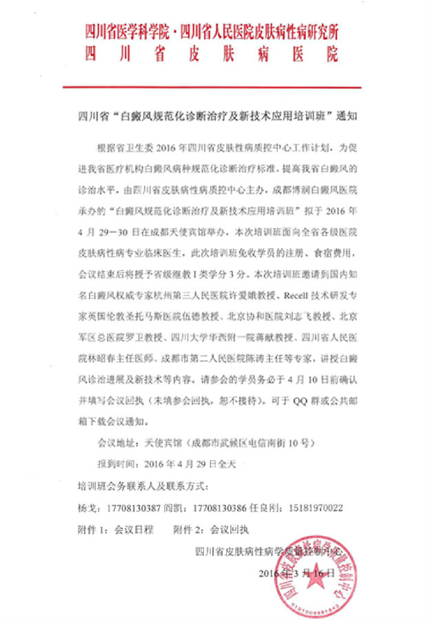 白癜风规范化诊断治疗及新技术应用会议是国内白癜风领域高规格、高水平学术会议。在届2015年四川省白癜风规范化诊断治疗及新技术应用研讨会中,成都博润白癜风医院因在规范化诊疗方面的突出贡献而被四川省人民医院副院长蔡力授予“白癜风规范化诊疗临床”铜牌。