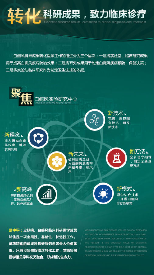 作为“四川省白癜风规范化诊疗临床”,医院常年致力于白癜风临床诊疗科研,研创、引进前沿诊疗技术,将白癜风治疗规范化、科学化,在提高临床见效率上做出极大成效,备受百姓和同行口碑称赞。“白癜风实验研究”的入驻,将权威科研与规范临床有效结合,以科研带动诊疗,以疗效充实学术发展,不断专研白癜风诊疗新技术,将有力实现白癜风医疗领域的新进程。
