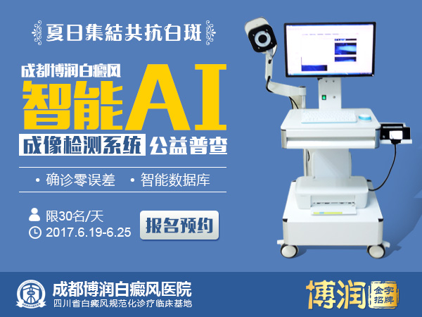 值此2017世界白癜风日来临之际,成都博润白癜风已远特开展“白癜风智能(AI)成像检测系统公益体验活动”(2017.6.19—6.25),助力广大白癜风患者精确确诊白斑,精准定位白癜风分型,有利于帮助制定出专属的个体化诊疗方案,对症施治,早日康复!