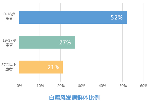 经卫生部门统计,我国目前约有1800万例白癜风患者,人群发病率大约为2%—4%,平均发病年龄21.91±14.64岁,其中0~18岁白癜风患者占总患病人数的52%,19~37岁占27%。发病的年龄多数集中在青少年时期,平均发病率为39.5%,青少年儿童白癜风形式严峻。