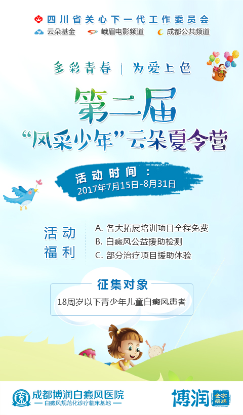 成都博润白癜风医院作为川内成立较早的白癜风专业诊疗机构之一,西南地区(目前)规模较大、诊疗系统较全面的白癜风诊疗机构;同时也是四川省皮肤病性病学质量控制授予四川地区的“白癜风规范化诊疗临床”,一直将青少年白癜风的防治和关爱白癜风青少年作为工作重点。鉴于上述青少年儿童群体白癜风发展现状,经医院党支部委员会和院长办公会研究决定携手四川电视台峨影频道和成都电视台联合开展第二届“多彩青春|为爱上色”——“风采少年”云朵夏令营活动。