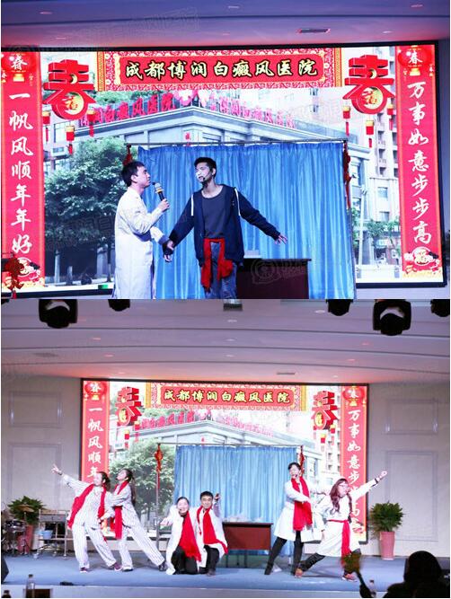 《回不去的年夜饭》中,喜庆热闹的除夕晚上,许医生被安排在医院值班,不能回家与家人团聚,因为查房女病人,被打电话查岗的老婆误解,主角许医生用唱跳的方式表达了医务人员那种舍小家为大家,用爱心和奉献守护患者健康的默默无闻的精神;《黎乡笠影》讲述的是黎家姑娘戴草笠的情景,用婀娜的舞姿表现了她们的风情万种,表达了她们在雨天的一种很享受、很喜悦的一种心情;作为我院的爱心大使,安澜带来了精彩绝伦的舞蹈模仿秀,他跳着迈克尔·杰克逊迷人的舞技,用精彩绝伦的表演展现了他战胜白癜风病魔的勇气和追逐梦想的毅力。三个节目的表演者在舞台上热情认真的进行着表演,赢得了现场阵阵掌声和欢呼声。