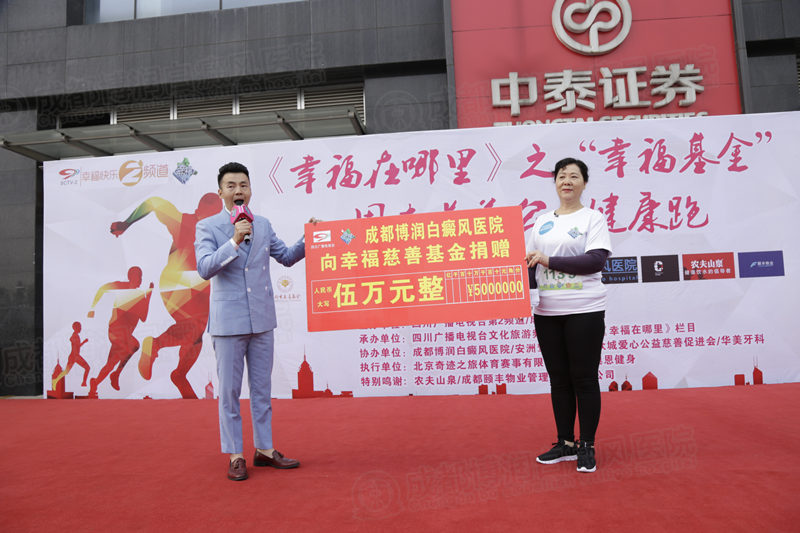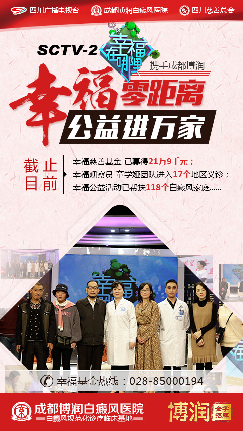 自2013年,我院更联合《幸福在哪里》栏目组与成都慈善总会,达成长期合作,联合成立了“幸福慈善专项基金”,专门用于节目中需要帮扶的弱势群体,用实际行动,让更多经济困难的白癜风患者得到救治。
