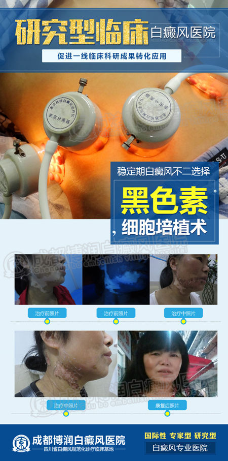 其中表皮移植术是目前国际医学界先进、有效的白癜风外科治疗手段,也是较为经济、容易让患者接受的白癜风治疗方法。表皮移植术通过仪器操作,一般从患者自身的腹部或者大腿内侧选取正常皮肤,从中提取分离正常健康黑色素细胞,再把提取培植分离好的黑色素细胞介入到白斑部位,同时配合细胞营养液,黑色素生长因子促使细胞吸收,包扎七天后拆敷料就能看见明显效果。通过自身黑色素细胞培养植入病灶部位使其自然生长,2周后移植表皮成活,色素生成,4周后黑色素加深扩大,3~6个月,黑色素不断生长蔓延,能够大面积快速覆盖白斑。
