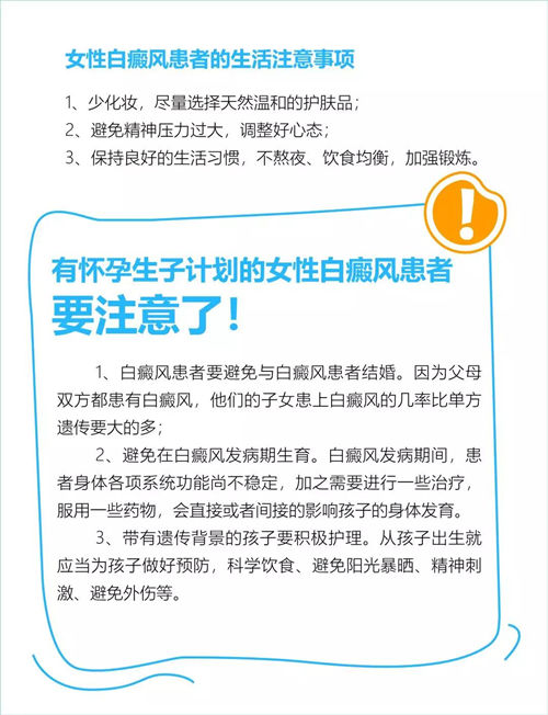 女性白癜风患者是可以正常婚育的,不管是结婚还是生子,女性白癜风患者都是可以和正常人一样的。白癜风的发病与遗传有关,但是遗传的几率很低。如果父母有白癜风病史或是家族中有成员患过白癜风的,子女患白癜风的几率就会比常人要高一些。但是,遗传只是白癜风发病的一个因素,有遗传基因的孩子并不是一出生就会患上白癜风,很多小孩都是由于后天外界诱发因素的刺激而患上白癜风的,比如说居住在污染、潮湿的环境里、经过强烈紫外线的照射以及精神状态不良和生活作息不规律、营养不足等,所以一般情况下,白癜风只有在遗传因素和环境因素的共同作用下才会发病。