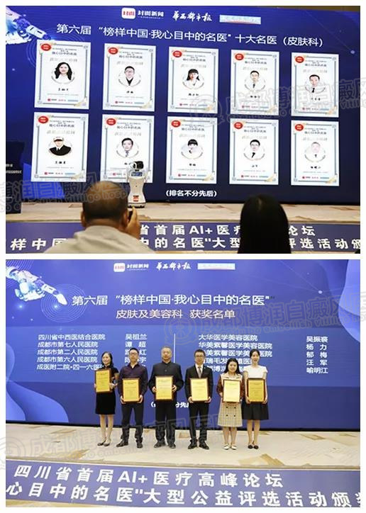 2018年9月16日上午,由四川省卫计委指导监督,封面新闻、华西都市报、家庭与生活报联合主办的四川省首届AI+医疗高峰论坛暨第六届“榜样中国·我心中的名医”大型公益评选活动的颁奖仪式在四川日报报业集团隆重举行。大会现场,我院喻明江主任荣膺“皮肤科十大名医”称号。