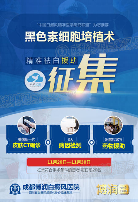 为帮助广大的白癜风患者解除白斑困扰,树立治疗信心。作为国际性、医生型、研究型白癜风专业单位、白癜风精准医学研究联盟成员,我院联合云朵公益,将于11月20日至11月30日,征集白癜风患者,援助表皮移植术项目!借此冀望广大白癜风患者真实感受到白癜风久治不愈只是“假象”,祛白其实很简单!